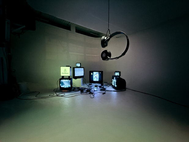 Flat Earth Premier (Seattle), For the Seattle screening of Flat Earth by Bataleon, we shifted toward a more intimate, gallery-like experience. The installation featured a cluster of CRT televisions looping brand imagery and film stills, paired with a headphone-based audio piece that revealed behind-the-scenes moments from the film’s creation.